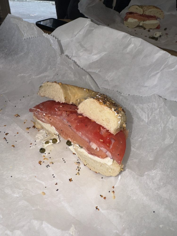 Smoked Nova Salmon, Cream cheese, Red onion, tomato, capers on a bagel.